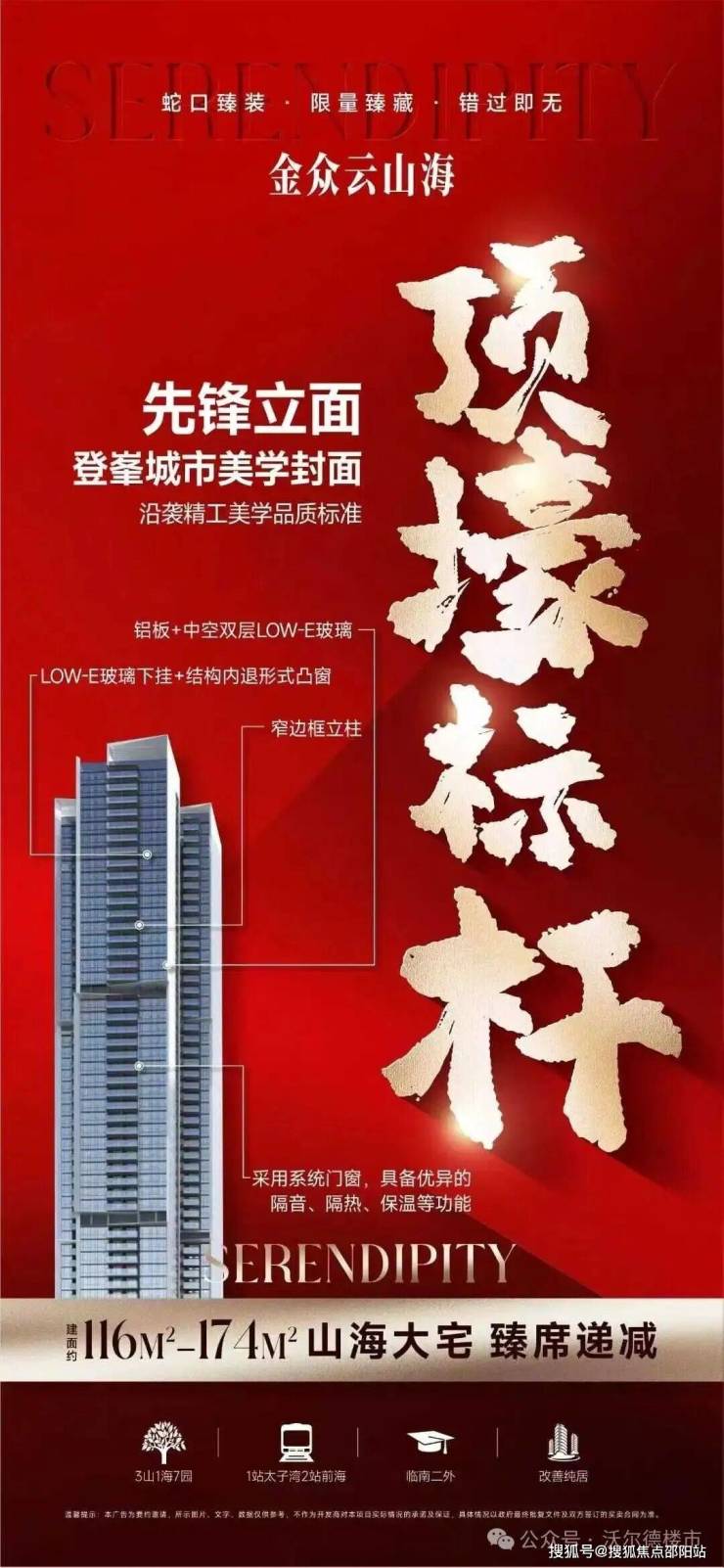 金众.云山海 坐落于深圳市南山区蛇口招商街道赤湾六路与港航路(郑和一路) 交汇处,项目共两个地块(宗地号K104-0043、K104-0044)(东区、西区),总用地面积约3.6万㎡,规划总建筑面积约19.5万㎡,其中计规定建筑面积约19万㎡,包括住宅、商业(800㎡)和幼儿园等配套用房。