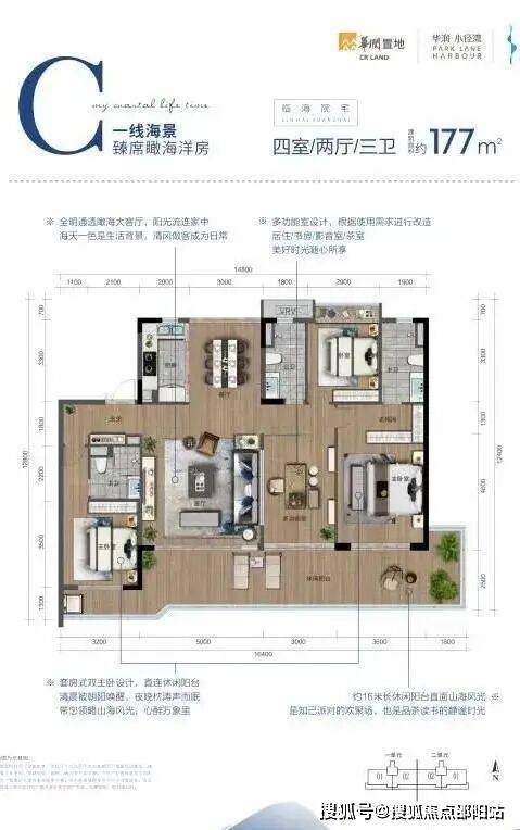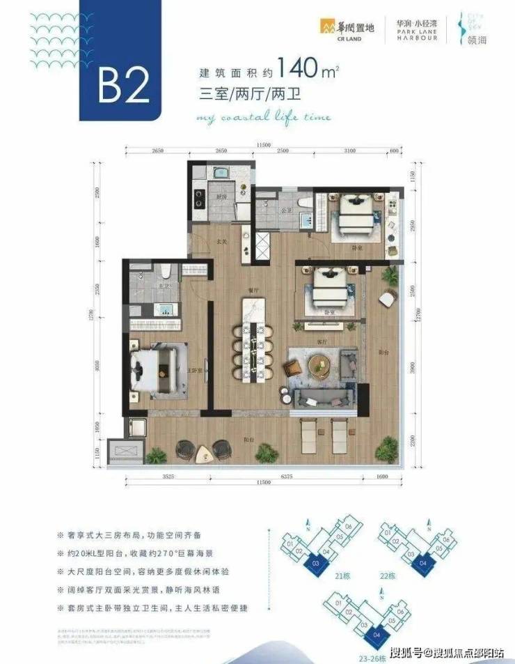 约125-140㎡阔绰三房,约20米L型阳台,270°巨幕海景