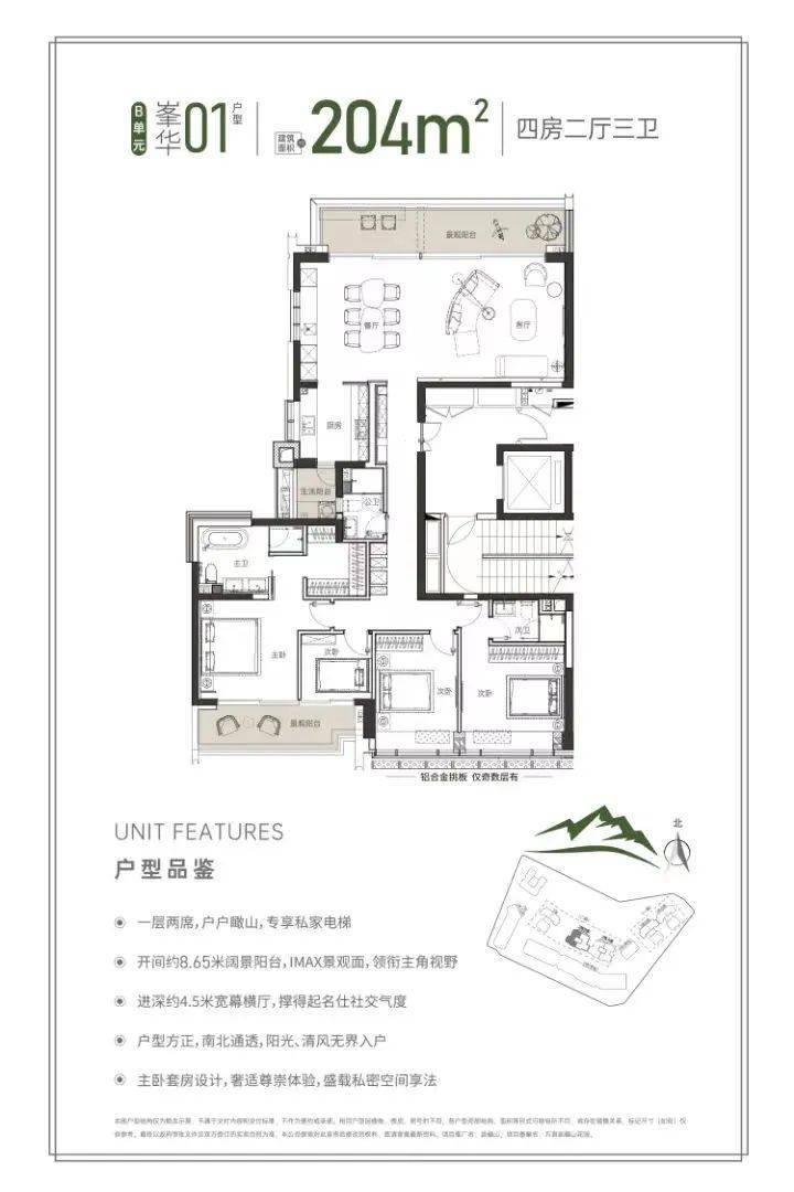 同样的专梯入户,豪宅感扑面而来,该户型为顶级大户型,四阳台设计,最大有10.55米的景观阳台和180度视野的餐客厅空间奢阔气场尽显,罕见的南北瞰景四阳台设计,让家的每个角落都能欣赏美丽的山景和城市景观。所有的开窗面都尽可能放大,客餐厅、书房、卧室、几乎都能享受超宽超大屏