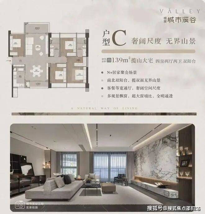 户型背山面海,超大的窗墙比将窗外无价的山海资源揽入户内,所有户型都可以看到开阔的山景,部分户型高楼层可以同时看到山海景观;南向大面宽、小进深,结合现代人家居理念的LDKB一体化设计,打造城市之芯的巨幕山海。