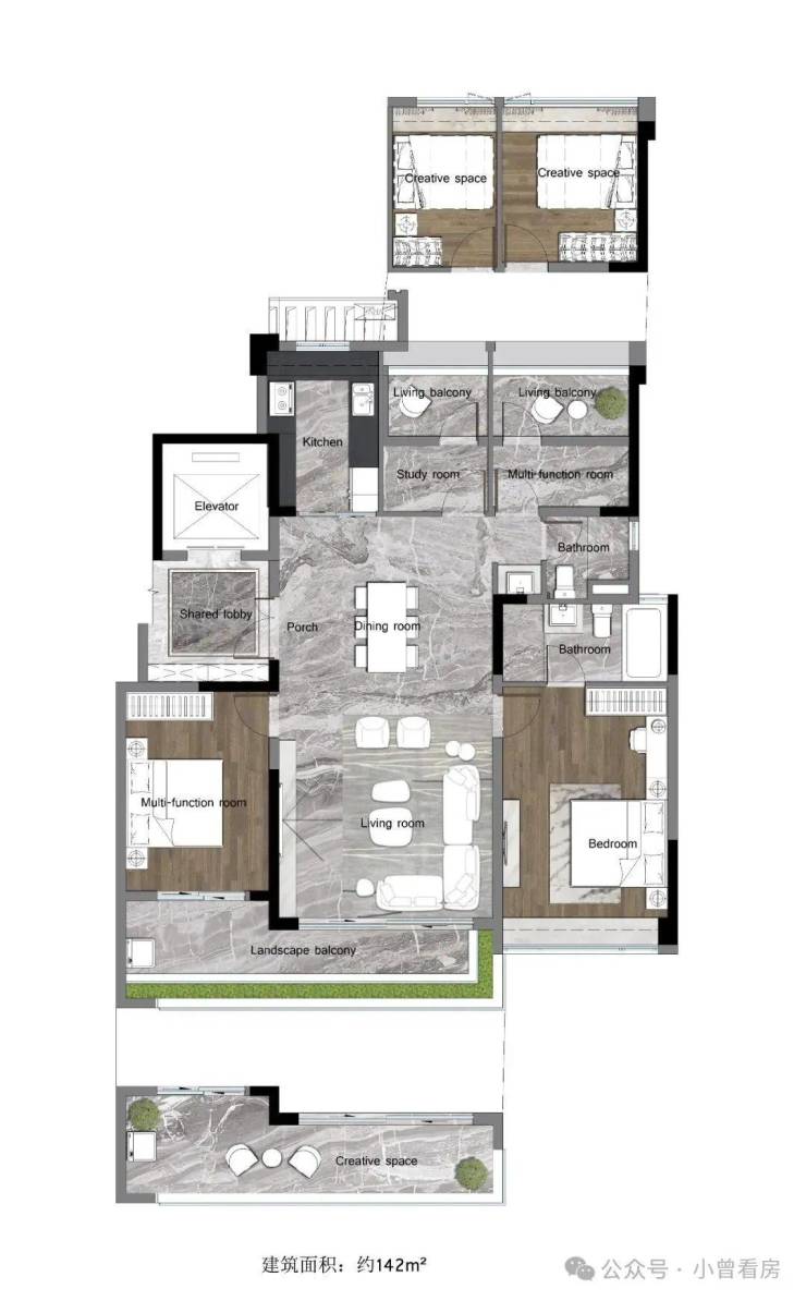 首先建面约142㎡四房有专梯入户,配有约7.9米景观阳台,连通次卧和客厅,客厅宽敞大气,而主卧开间约3.7米,配独立衣帽间和卫浴,厨房为U型设计,方便实用。