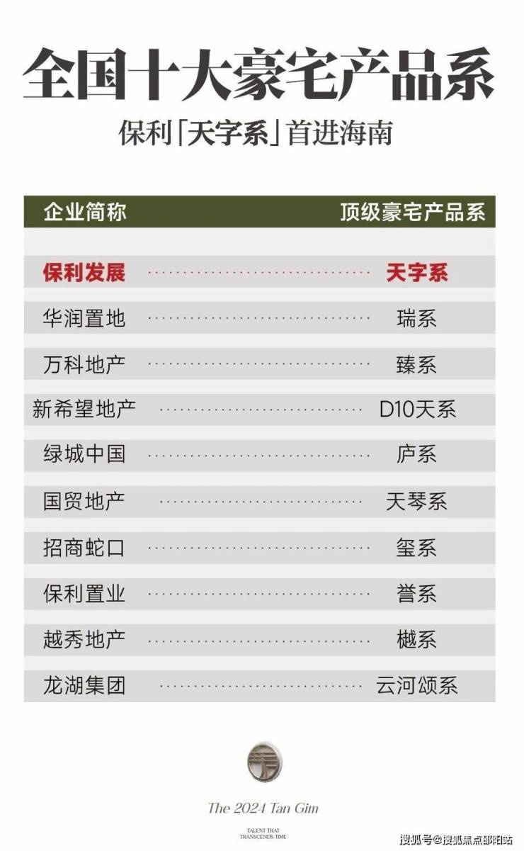 天字系,以客户需求为圆心,根据城市基座,提出“甄选城芯、产品打造、服务配置”三个方面的严苛要求,因而成为保利顶级豪宅产品系。且是全国十大豪宅产品系中首位进入海南的。