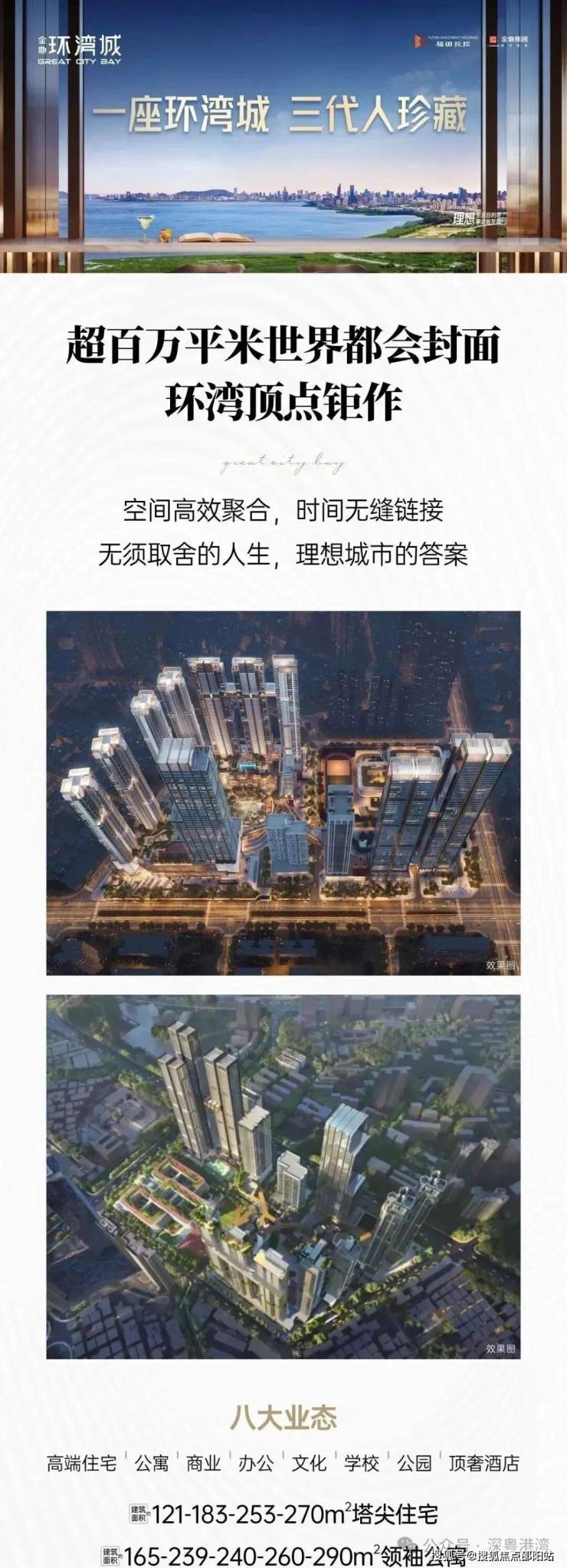 金地环湾城由福田区政府全资企业福田投控与金地集团联袂打造,是深圳福田核心区罕见的百万方城市综合体(总建面103万㎡)。项目聚合八大高端业态:塔尖住宅、领袖公寓、红岭名校、嘉佩乐隐奢酒店、商务地标、绿地公园、漫调商业、文化艺术,致力于打造“理想生活目的地”与“事业始发站”。