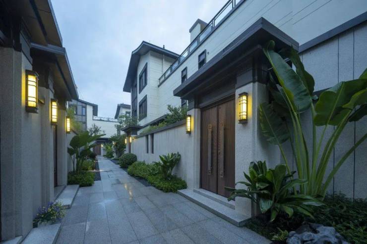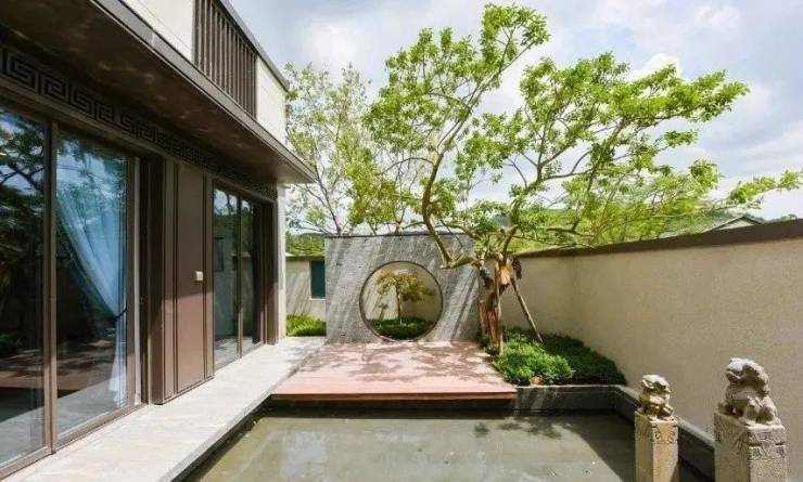 合院采用岭南设计风格,270°风光围合,用石材铺装,以草坪加灌木、乔木的方式创造出了多重立体植物的庭院空间,以石柱、月洞门等景观小品加以点缀。