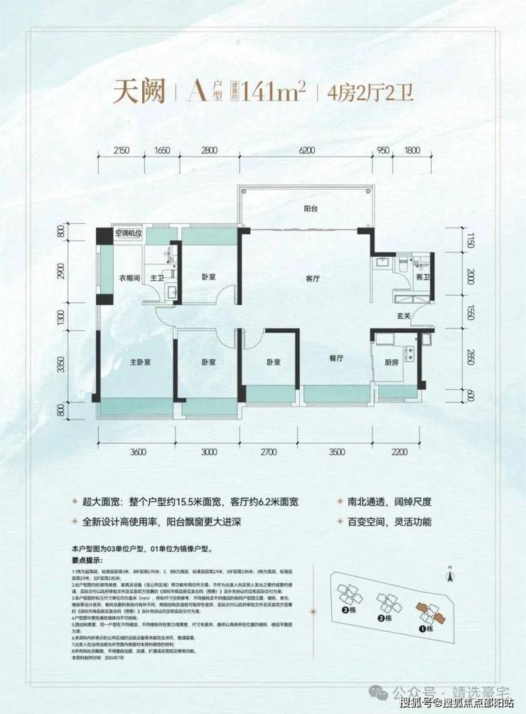 以豪宅标准打造超大户型面宽,约141㎡大四房户型,整个户型15.5米超大面宽、南北通透,客厅6.2米超大面宽,甚至具备可变“五房”的灵活空间改造潜力。
