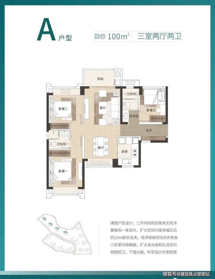 100㎡通透性三房两厅2卫大三房,2.5m超长玄关,南北通透,景观大阳台