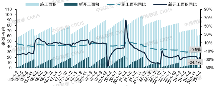 房屋施工面积:1-3月份,全国房屋施工面积为61.37亿平方米,同比下降9.5%。其中,住宅施工面积为42.72亿平方米,同比下降9.9%。