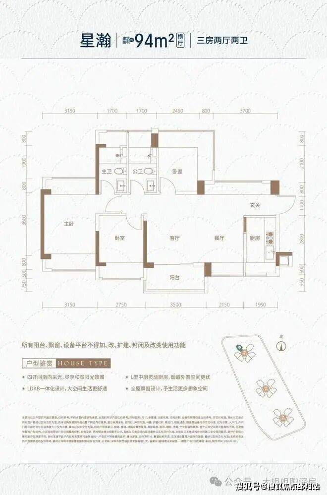 94㎡的3房2厅2卫(-2),设计的是横厅南北通透格局,独门独户,进门入户玄关,客餐厅5.7米开间,LDKB一体化,全屋10面飘窗,主卧南北通,U型厨房,卫生间干湿分离,得房率约93.73%(包含赠送),阳台主朝西南向