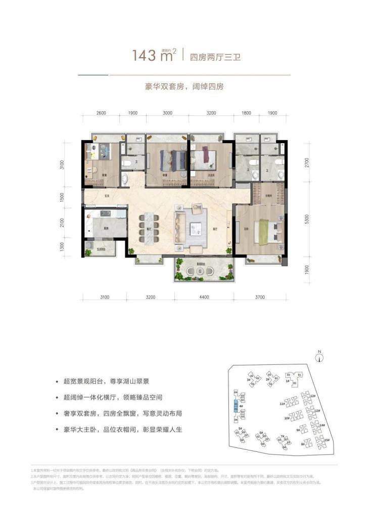 约143㎡四房两厅三卫:豪华双套房,阔绰四房