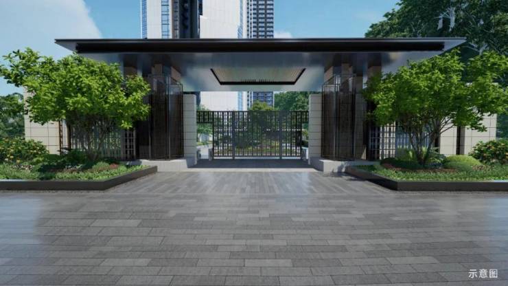 再看金众的设计图中,一一来看,大门让人眼前一亮,现代中式建筑精髓融合现代化格调,沿袭了金众公馆系的基因。超尺度设计,高端大气,美感外溢且内外协调。