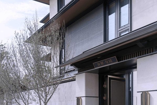 项目以宋代生活为研究模板,结合金地的“科学筑家”理念,通过屋檐、平座、挂落、寻杖等传统中式建筑元素的现代演绎,在功能性与美学感知的平衡上进行精细化的节点设计。“以材为祖”打造全新的现代宋风符号;精工匠造,还原宋代建筑神韵;屋脊设计使用现代材料呈现纤细感、水平感;寻杖在转角望柱搭交而伸出,打造定制化极简的双层绞角造;整体色彩借鉴了宋画里茶白、鹤灰、玄天、缃黄,雅致又有层次感。