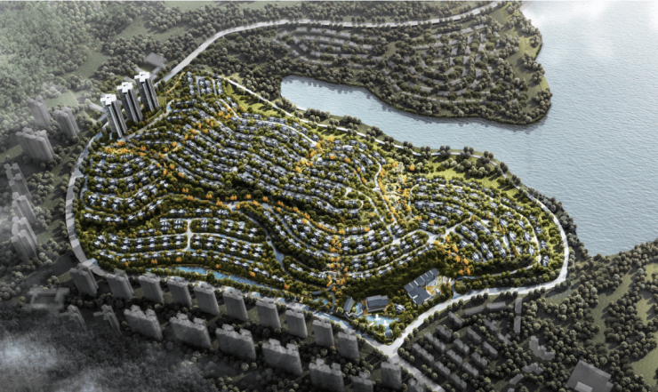 整体规划布局依山而建,尊重原始地形,采用错落有致的设计手法,巧妙地将山水之美融入社区的每个细节,确保每一户都享有私密性的景观视野;竖向设计上,创新性地采用了先行策略,通过高挖、低填、预留放坡空间、合理分台等方法,巧妙地处理了高差问题,并使得每一户都能享受到由高差带来的特有景观。