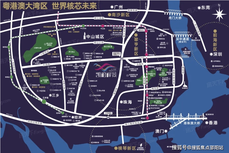 位于中山南部珠海北部,多维立体交通路网:深中通道(建设中)、深珠通道(规划中)、港珠澳大桥(已通车)、广珠西线、京珠高速、珠海轻轨北站。实现与大湾区城市的互联互通,打造“广深中珠1小时生活圈,与港澳30分钟内互达”的时空距离;
