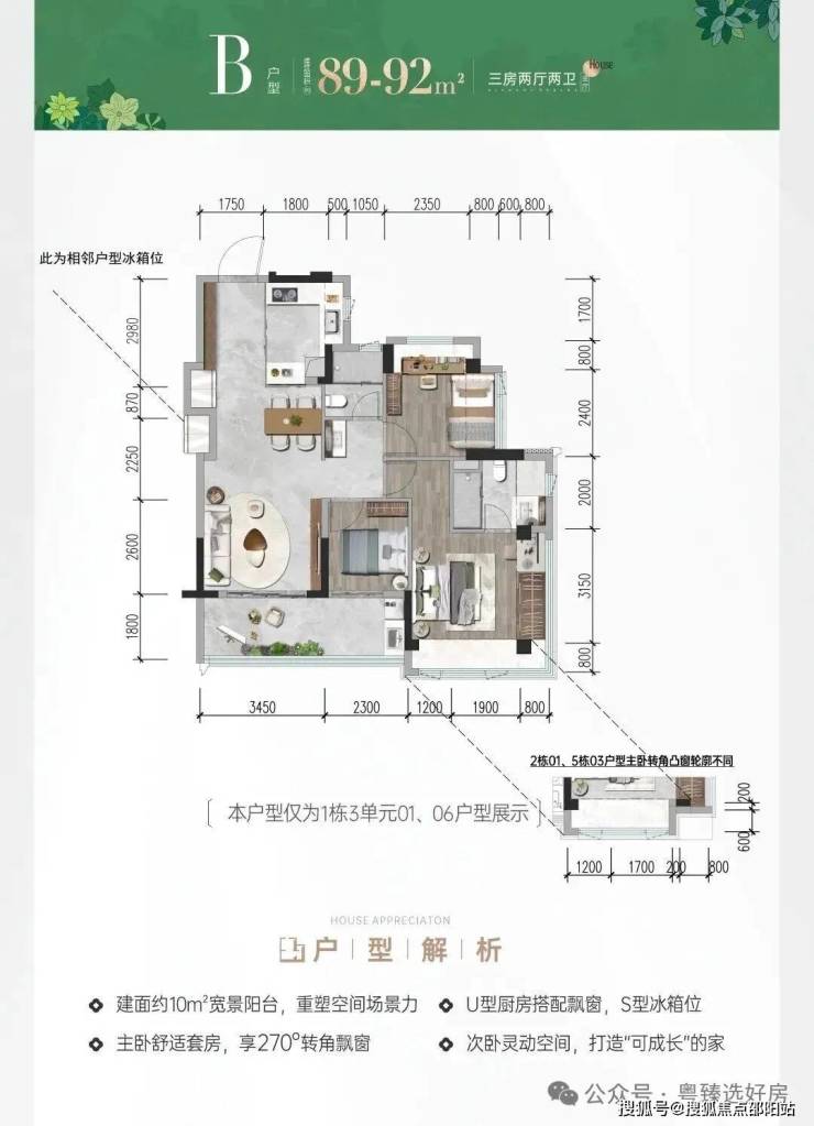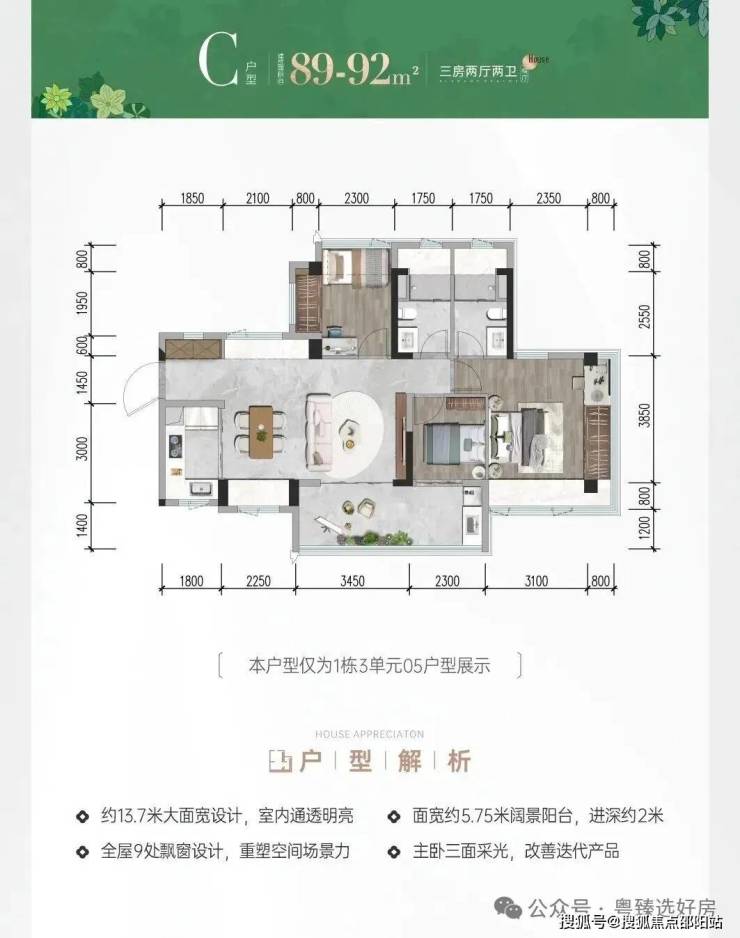 前海会展首发建面约78-117㎡三四房新规作品,户型拓展后实际使用率最高可达105%;主、次卧270°转角双飘窗(建面约117m次卧除外);建面约9-13㎡新规宽景阳台重构居住想象