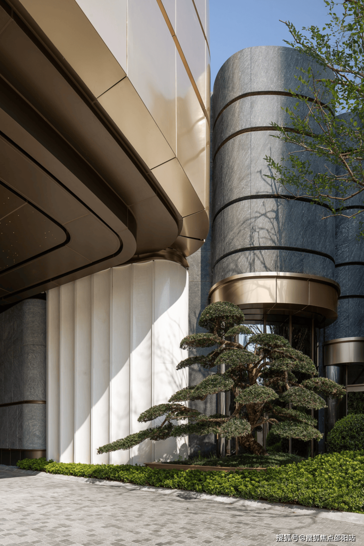主入口:黄铜铝板门楼与流云灰石材墙面交织,地面铺装黑灰天然石材,配以3米高迎客松阵列,归家仪式感十足;