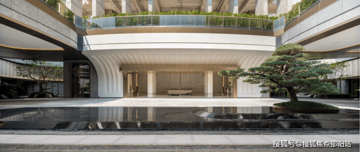 园林由AECOM亲自操刀,以“立体都市森林”为概念,通过架空层连廊、下沉庭院与空中平台交织出多重景观维度。中心庭院植有一棵约5米高迎客松,与无边界水景、普拉达绿奢石墙面构成“松风水月”之景,呼应岭南“四水归堂”的传统哲思。