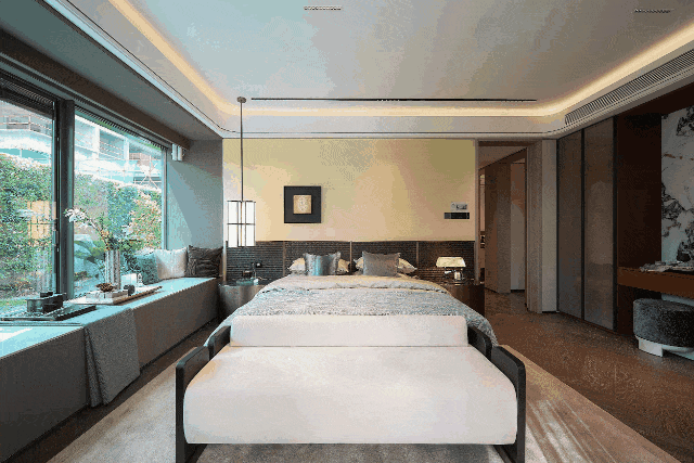 CBD人物私享双主套设计,为私有领域预留足够的空间和尺度,居住舒适度尽情释放。主卧奢配观景阳台,270°无界观景,双层LOW-E隔音玻璃,每晚于繁华之上静谧安眠。