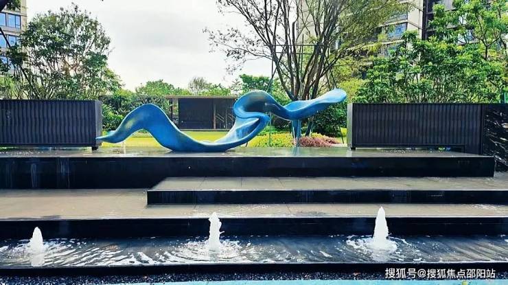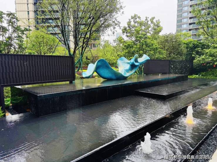 由云朵雕塑、多层石阶、小喷泉等组成的水景,是云海湾的标志之一。其中,背景选用了两大板古驰黑奢石,天然的纹理自然又耐看。