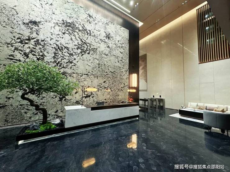设置了酒店式水景,搭配金属材质的格栅元素、充满粤式风情的罗汉松及奢石,带来端庄典雅的归家体验。