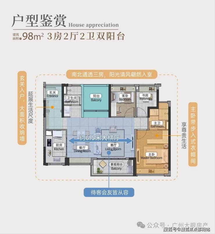 建面约96m²南北通透四房,约6.5米大横厅,延伸生活尺度