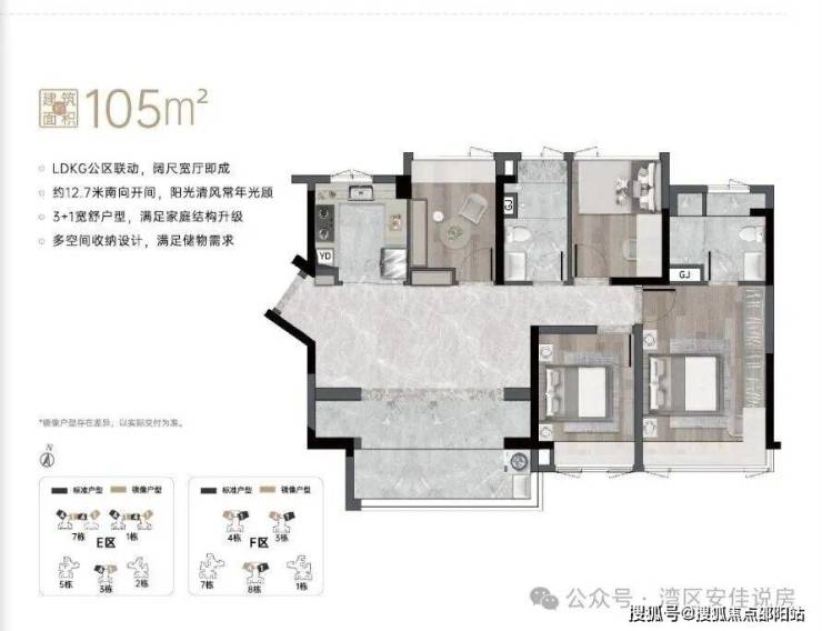 所有户型均为三开间朝南,180度全面向阳,建筑面积约89㎡/105㎡更有超大面宽阳台。