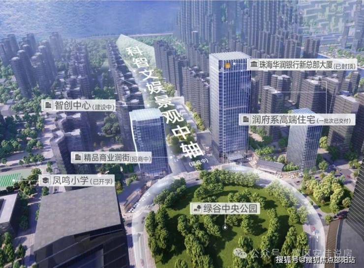 业态涵盖:珠海华润银行新总部大厦(即将入驻)、华润置地配建凤鸣小学(已开学)、华润精品商街-24H漫生活街区(招商中)、科智文娱景观中轴(在建)