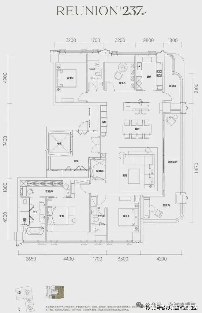 约237㎡四房三卫两厅、三面采光、双主卧套房、270°环幕视野。