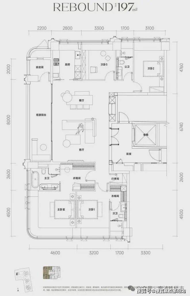 约197㎡四房三卫两厅、三面采光、主卧套房、270°转角奢华空间全景落地窗。