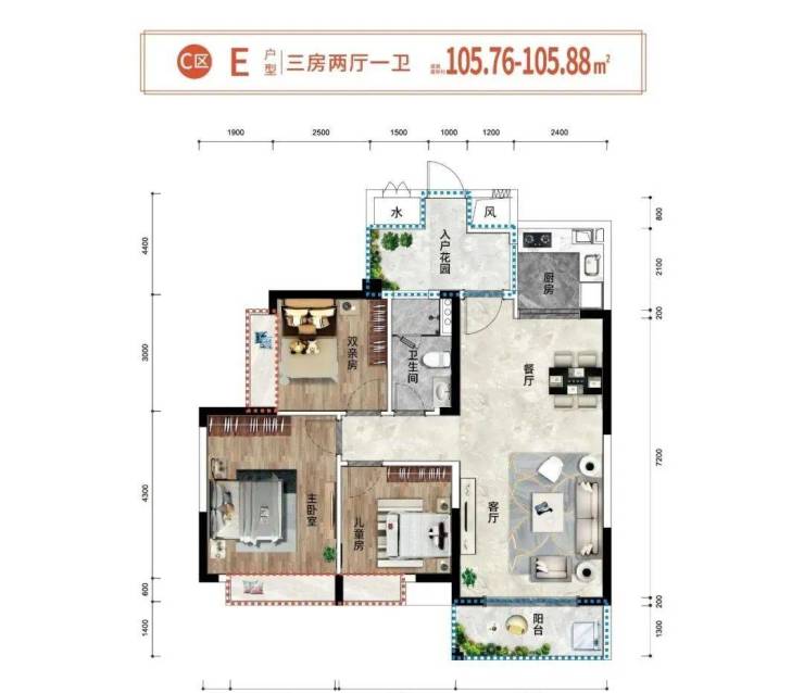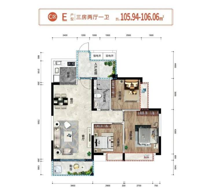 E户型亮点🔹入户花园,营造归家礼序,开门即是风景🔹餐客一体,通透大气,盛放阖家幸福时光🔹南向阳台,包揽一城锦绣,纵享闲适意趣🔹奢阔卧室,均带宽景飘窗,私享雅致人生