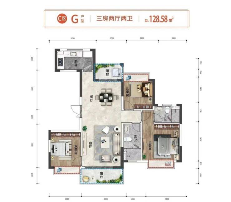 2#楼在售产品:住宅(16层)🏖G户型约128.58㎡(三房两厅两卫)