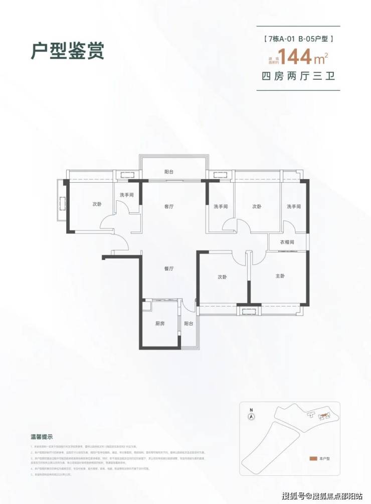 144㎡的4房2厅3卫,设计的是竖厅南北通透格局,进门入户玄关,LDKB一体化设计,双主卧套房,L型厨房还带1个生活阳台,公卫干湿分离,得房率约82%(不含赠送),阳台主朝西北向。