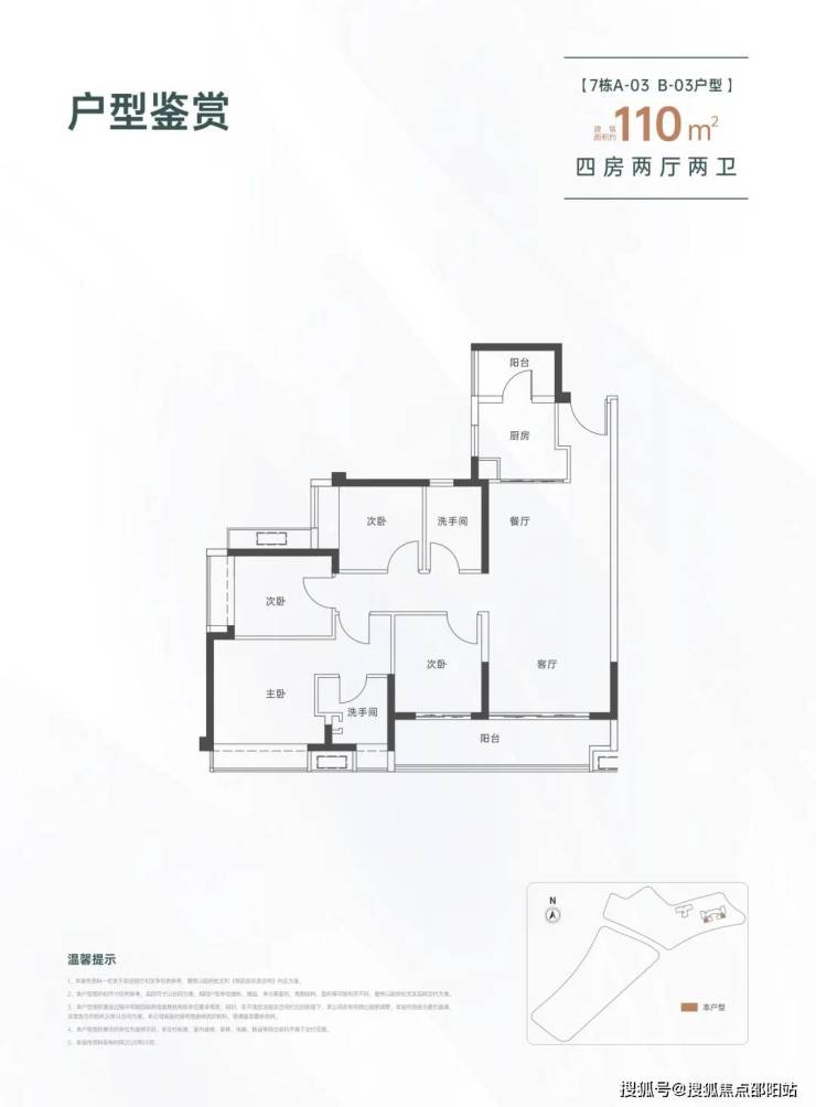 110㎡的4房2厅2卫,设计的是经典竖厅格局,进门入户玄关,LDKB一体化设计,四开间朝南,动静分区,客厅连接次卧出大阳台,L型厨房还带1个生活阳台,卫生间干湿分离,得房率约82%(不含赠送),东南朝向。