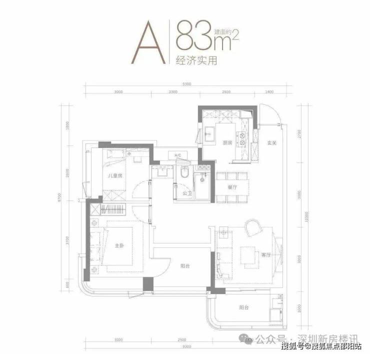 83㎡的3房2厅1卫,设计的是竖厅格局,客厅3.4米开间,客餐厅一体化,三开间朝阳,3个卧室分别是3米/2.9米/2.6米的宽度,U型厨房,卫生间三段式分离设计,得房率:75.64%(不含赠送),有朝南向或东北向。
