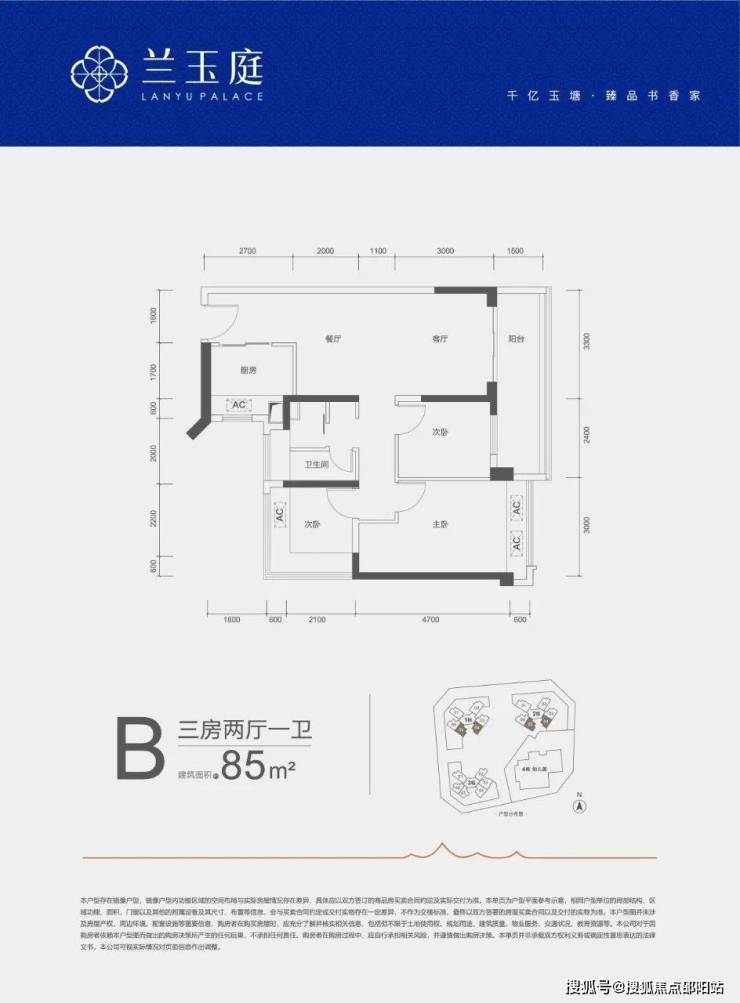 85㎡的3房2厅1卫,A户型,设计的是竖厅格局,客厅开间3.3米,LDKB一体化,三开间朝南,3个卧室分别做到了3米/2.8米/2.4米的宽度,客厅连接次卧出5.7米长的大阳台,L型厨房,得房率约79%(不含赠送),西南或东南朝向。