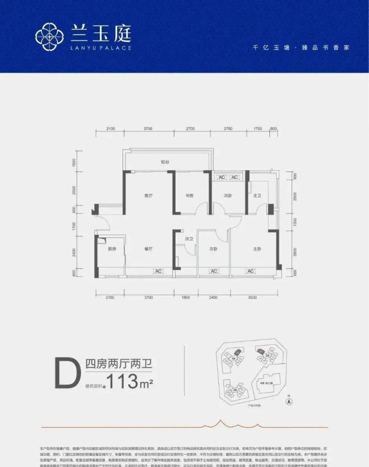 113㎡的4房2厅2卫,D户型,设计的是竖厅南北通透格局,客厅开间3.7米,4个卧室分别做到了3.5米/2.7米/2.7米/2.4米的宽度,客厅连接次卧出6.4米长的大阳台,U型厨房,公卫三段式分离,得房率约79%(不含赠送),阳台主朝西北或东北向。