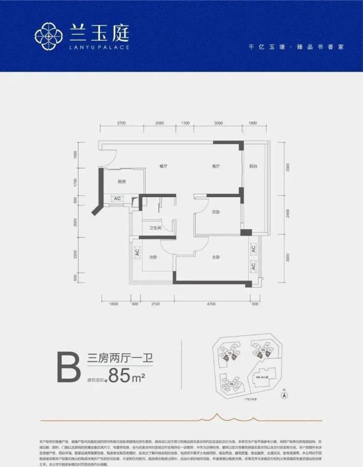 85㎡的3房2厅1卫,B户型,设计的是竖厅格局,客厅开间3.3米,LDKB一体化,三开间朝南,3个卧室分别做到了3米/2.7米/2.4米的宽度,客厅连接次卧出5.7米长的大阳台,L型厨房,创新式三分离卫生间,得房率约79%(不含赠送),西南或东南朝向。