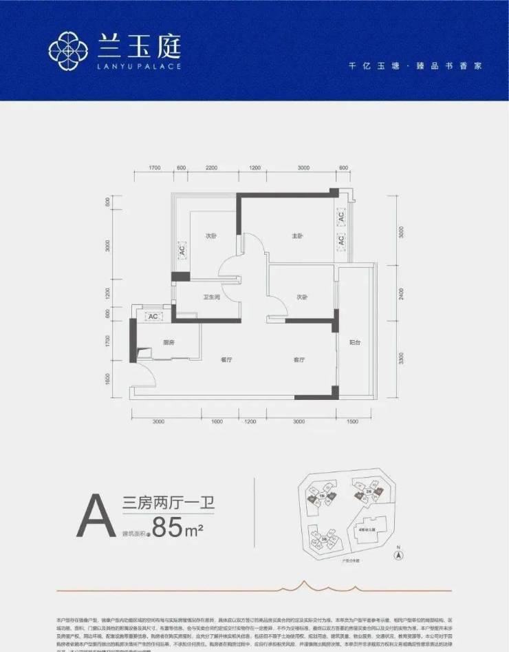 85㎡的3房2厅1卫,A户型,设计的是竖厅格局,客厅开间3.3米,LDKB一体化,三开间朝南,3个卧室分别做到了3米/2.8米/2.4米的宽度,客厅连接次卧出5.7米长的大阳台,L型厨房,得房率约79%(不含赠送),西南或东南朝向。