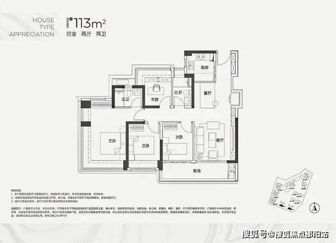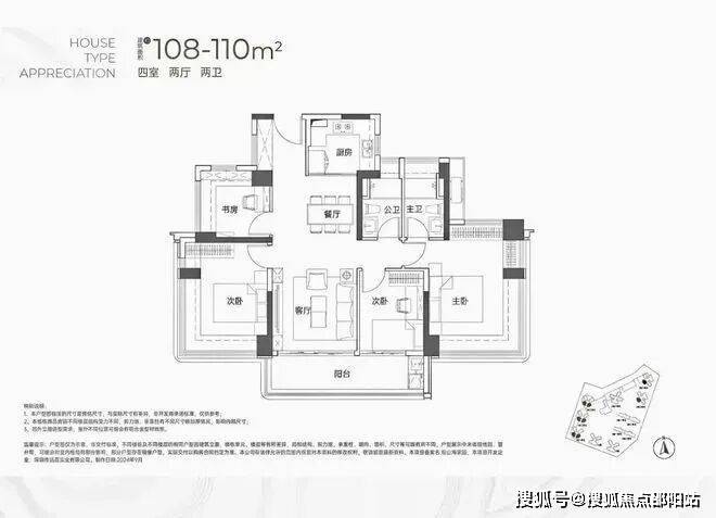 面积约为108-110㎡的4房2卫户型,其设计也颇具匠心。该户型为西南向或东南向,同样采用了传统的竖庭设计,确保了南北通透的居住体验。阳台的设计同样出色,从客厅一直延伸至次卧的对面,使得空间显得格外宽敞。此外,该户型的动线设计也相当清晰,动静分区合理,特别是两个卫生间紧密相邻,为居住者带来了极大的便利。