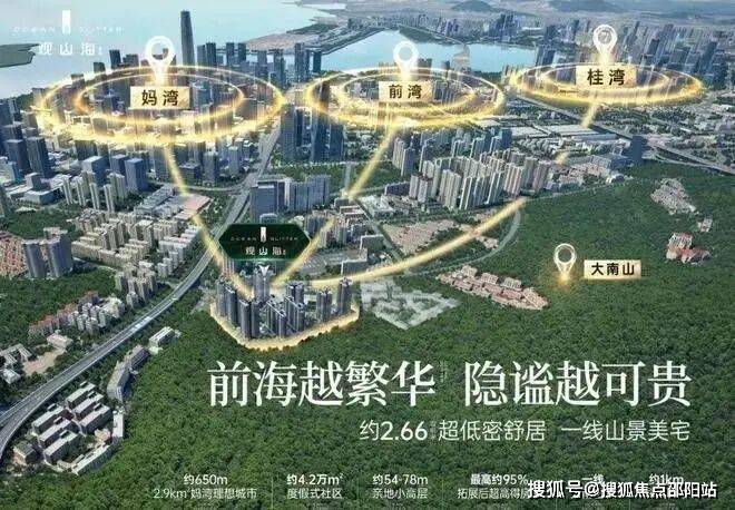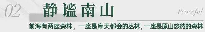 大南山生态住区项目所在前海合作区大、小南山片区西组团规划定位重点安排教育、配套、体育等公共服务设施和生活服务设施(数据来源:《中国(广东)自由贸易试验区深圳前海蛇口片区及大小南山周边地区综合规划》与【桂湾】国际金融城和【妈湾】深港国际服务城两大前海核心区引擎形成前海黄金三角,工作、生意生活尽在掌握山海通廊:约650米两个红绿灯,咫尺2.9k㎡妈湾理想城市约 53.8 公顷绿地公共空间,营造全域公园城市,宜业宜居的绿色人文之城