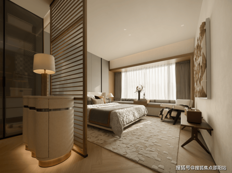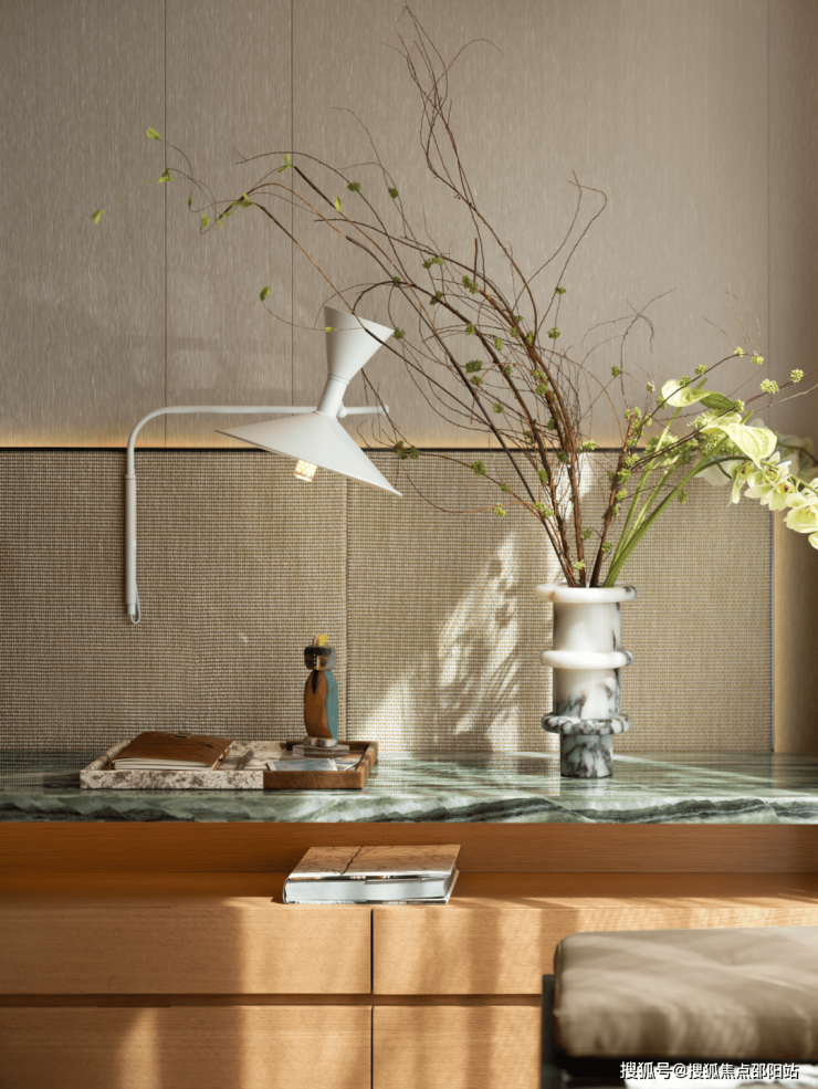 以优雅的米黄色和庄重的深灰色为主调,通过质感涂料和高品质铝板的搭配,营造出“远山如黛”般的朦胧意境,尽显宁静悠然之态。