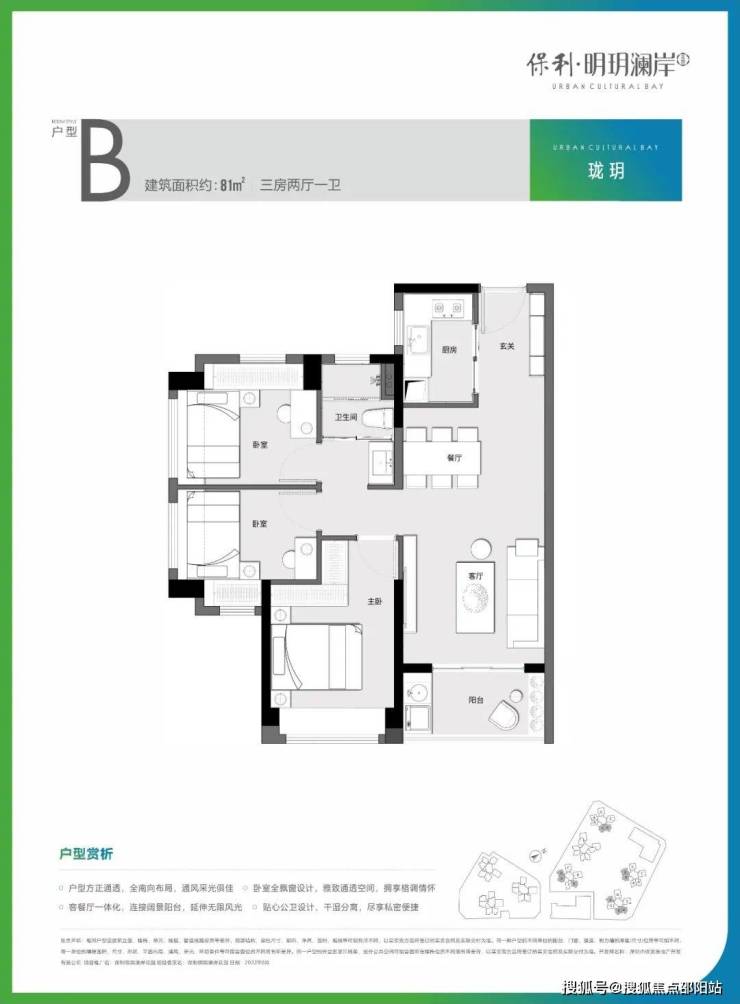 81㎡的3房2厅1卫,设计的是竖厅格局,客厅3.4米开间,LDKB一体化设计,进门独户玄关,动静分区,U型厨房,卫生间三段式分离,得房率:75.6%(不含赠送),阳台有西南向、东南朝向或朝西向。