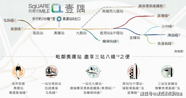 「利奥坊.壹隅」位于西九核心黄金圈,邻近兴中九龙干线,约9分钟车程直达东九龙CBD,约5分钟车程直达西九龙ICC,约9分钟车程达中环ifc。中九龙干线采用双程三线分隔车道的设计,连接西九龙的油麻地交汇处与东九龙的启德发展区和和九龙湾道路网。繁忙时间取道干线来往西九龙与九龙湾商贸区的车程约5分钟。