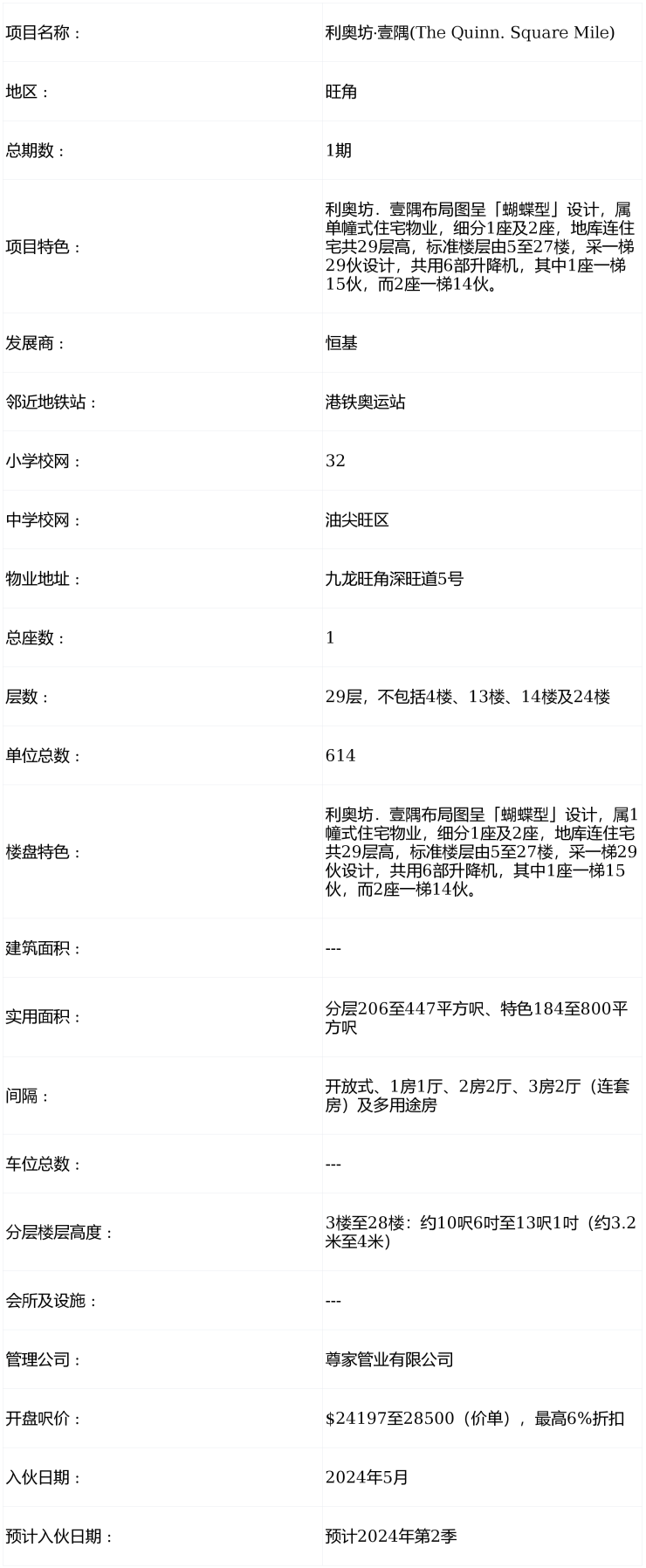「利奥坊.壹隅」为「利奥坊」系列旗舰之作,极为瞩目的西九艺绿潮都新地标。住宅大楼由屡获殊荣的LWK + PARTNERS设计,基座延续「利奥坊」系列的流线型建筑,别具创意的“蝴蝶形”大楼布局,让更多高层住宅单位拥览海景。大楼幕墙采用双层中空玻璃,提升采亮度及隔热保温功能,更有效阻隔噪音,展现活力大都会极具实用性的建筑美学。「利奥坊.壹隅」住宅入口设逾14米高的特色LED艺术幕墙,由逾28,000颗LED组合而成,气势宏伟,日夜展现不同风采,散发艺文气息,洋溢豪宅气派。