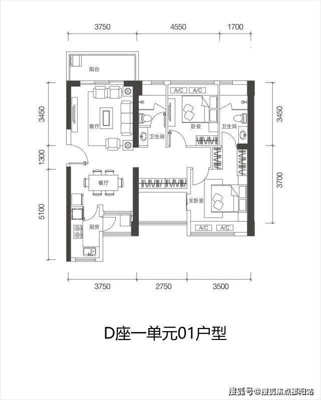 D栋一单元02户型:88㎡ 3房2厅1卫