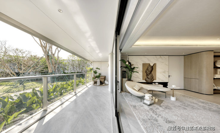 步入室内,就是约10㎡的私享电梯前厅,层高约3.5m,三面采光的公区,270°无柱环形端厅,延伸出约44米的观景面,尽显主人气场。
