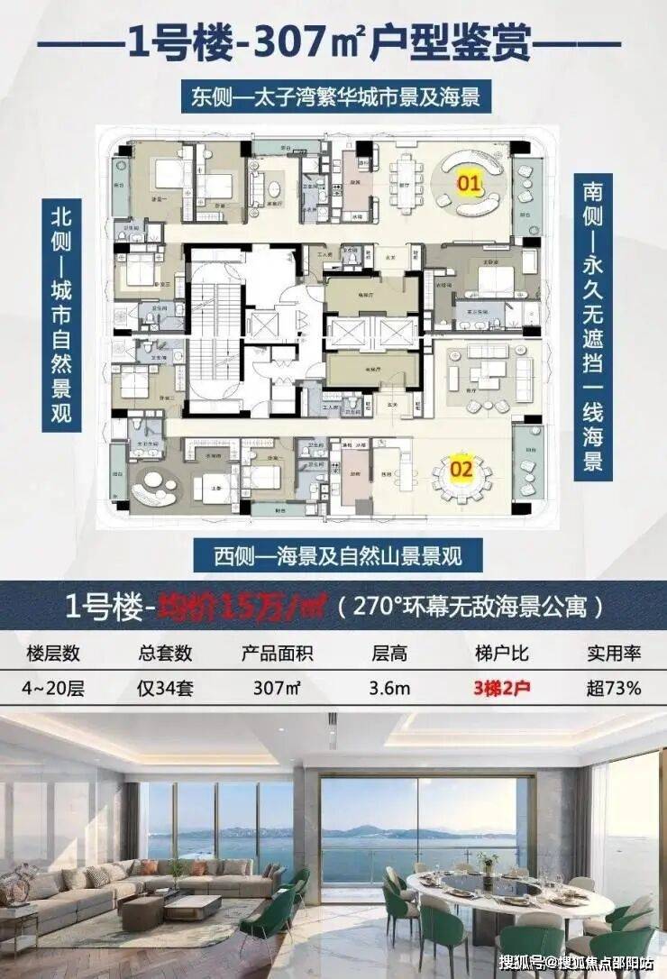招商太子湾鲸域总建面约2.3万㎡,容积率合理,绿化率22%,规划2栋双塔高层建筑,仅70套房源,圈层纯粹度极高。主力户型涵盖233-307㎡,主打233㎡4+1房、307㎡4+1房,梯户比2梯2户或3梯2户,专梯入户,3.6米奢阔层高,户户三阳台,270°IMAX环幕海景,适配塔尖家庭与商务社交需求。