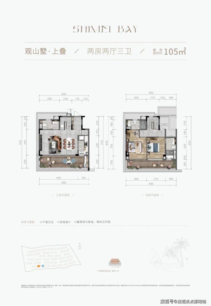 |建筑面积约105㎡○三卫设计,舒适起居,生活自在不拥挤○户型方正,全明设计,纵览山海风景○LDKB专享度假感格局,丰富生活层次○餐客厨与卧室,南向三开间,阳光满室○套房式主卧,约8.4m朗阔阳台,环瞰山海