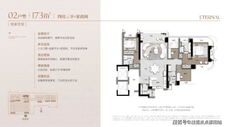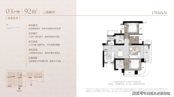 采用新规户型,使用率超90%,空间利用率高。主力户型如92㎡三房、105㎡三房+1房、123-126㎡四房、173㎡四房+1房,部分户型配备270°环幕采光、专梯入户、弹性方厅等设计,满足刚需到改善型需求。