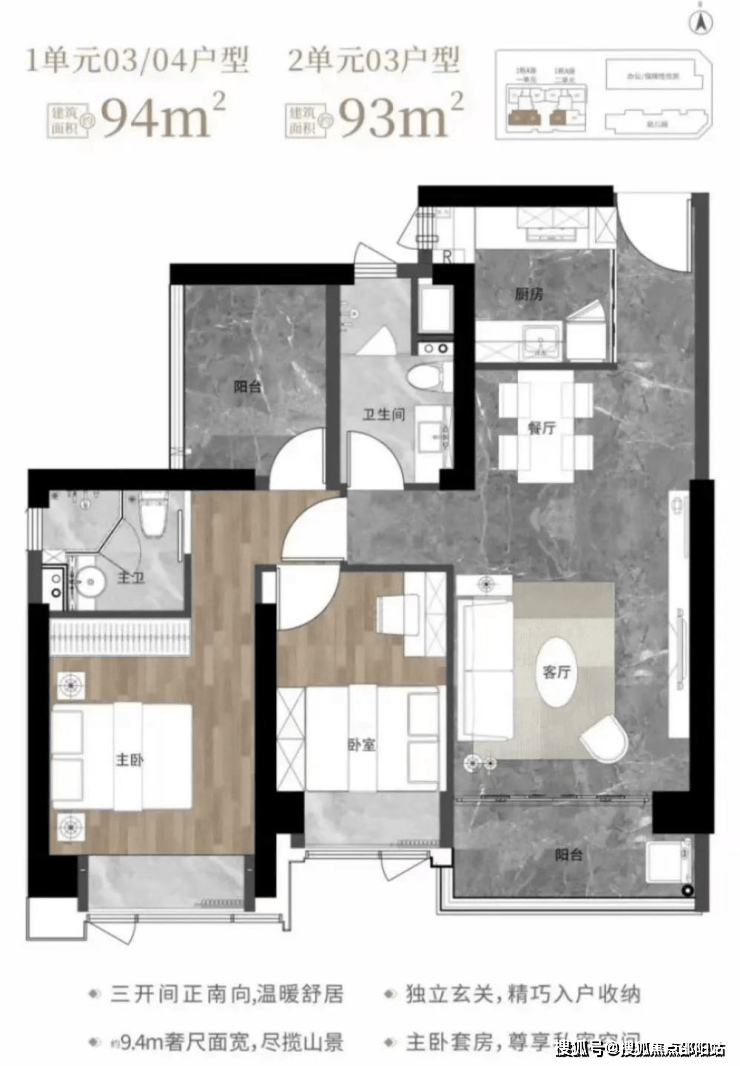 93-94㎡的3房2厅2卫,1栋1单元03、04户型/1栋2单元03户型,设计的是经典竖厅格局,客厅3.6米开间,LDKB一体化设计,动静分区,三开间朝南,9.4米面宽,二字型厨房,卫生间干湿分离,阳台正南朝向。