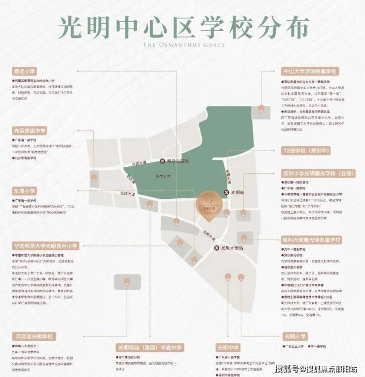文体方面:光明最大的科学公园,总占地约2.08平方公里,还有深圳科学馆,西方美术馆,艺术中心,科学方舟等市政配套。